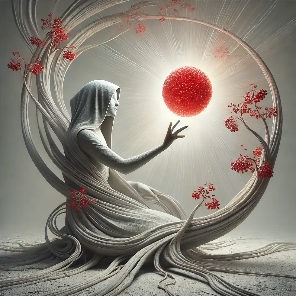 The vibrant red color of the orb stands in stark contrast to the grayscale background, reinforcing its significance. This glowing sphere is not just a physical object but a symbolic manifestation of life, passion, and mystery. In the presence of this orb, the figure reaches out as if seeking connection, yearning to touch or absorb its knowledge. Yet the orb remains just beyond reach, a reminder that not all truths are easily grasped.